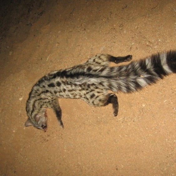Genets possess extremely long tails, typically around one to one and a half times the length of their bodies. Their bodies are typically 16.9 to 22.9 inches long, while their tails are approximately 15.4-20.9 inches long. These longs tails provide a highly effective counterweight that enables them to easily maintain balance as they leap from tree limb to tree limb. However, the length of genets’ tails does not necessarily correspond to them inhabiting a more woody habitat. They are not strictly terrestrial, and spend much of their time in trees. Genets have semi-retractable claws, which they use for climbing and holding prey, but not for fighting.