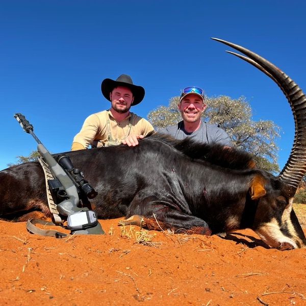 The sable antelope is a large species. It ranges from 117 to 143 cm (46 to 56 in) tall at the shoulder and measures 190 to 255 cm (75 to 100 in) long, not counting a tail of 37–76 cm (15–30 in).