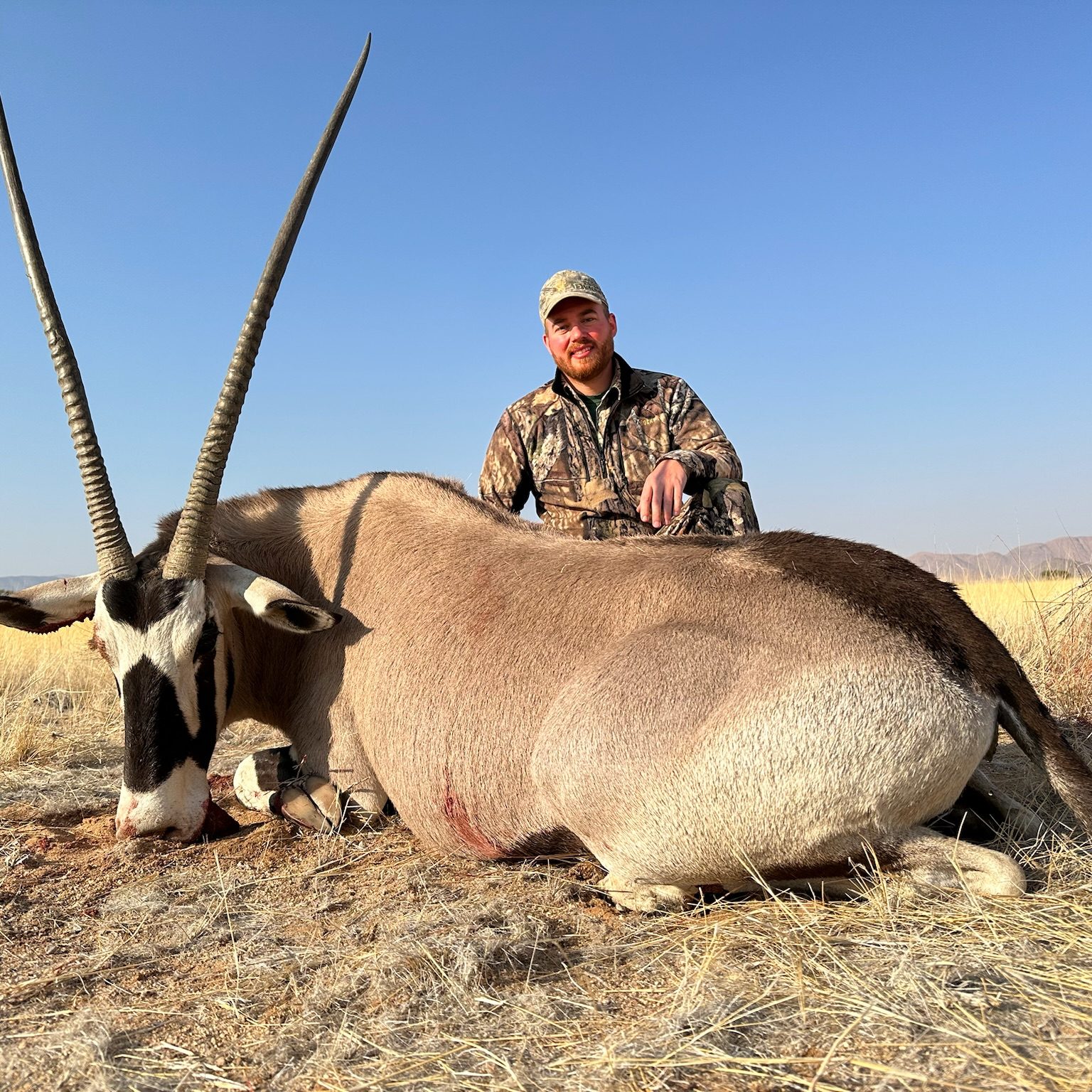 Oryx, also known as Gemsbok are light brownish-grey to tan in colour, with lighter patches toward the bottom rear of the rump.